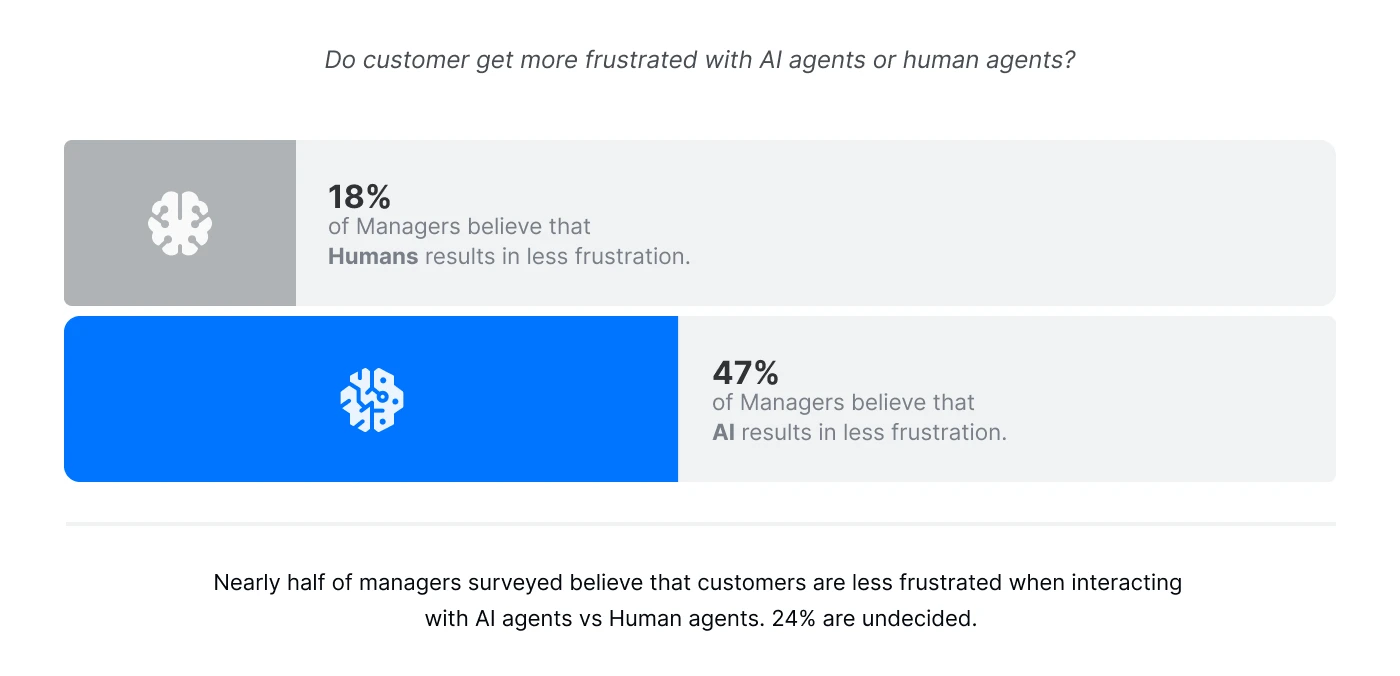 Nearly half of managers (47%) believe customers become less frustrated when interacting with AI because of its speed and efficiency. Yet nearly a third (29%) disagree, making it clear that faster responses don’t automatically mean better experiences.