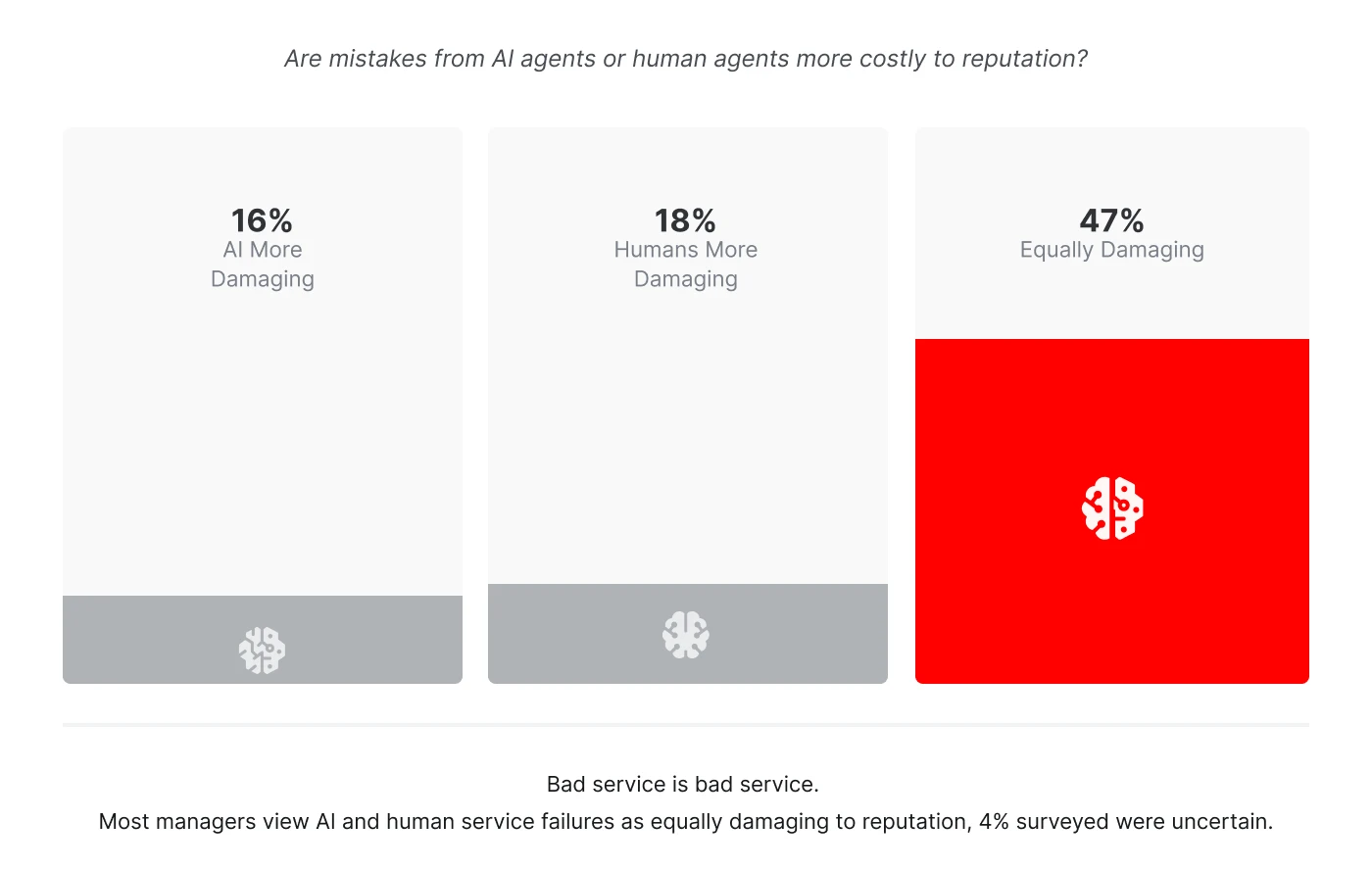 When it comes to brand risk, managers overwhelmingly agree that bad service is bad service—no matter who delivers it. A full 62% said both AI and human service failures are equally damaging to a company’s reputation, while only 18% blamed human agents more and 16% blamed AI agents more.
