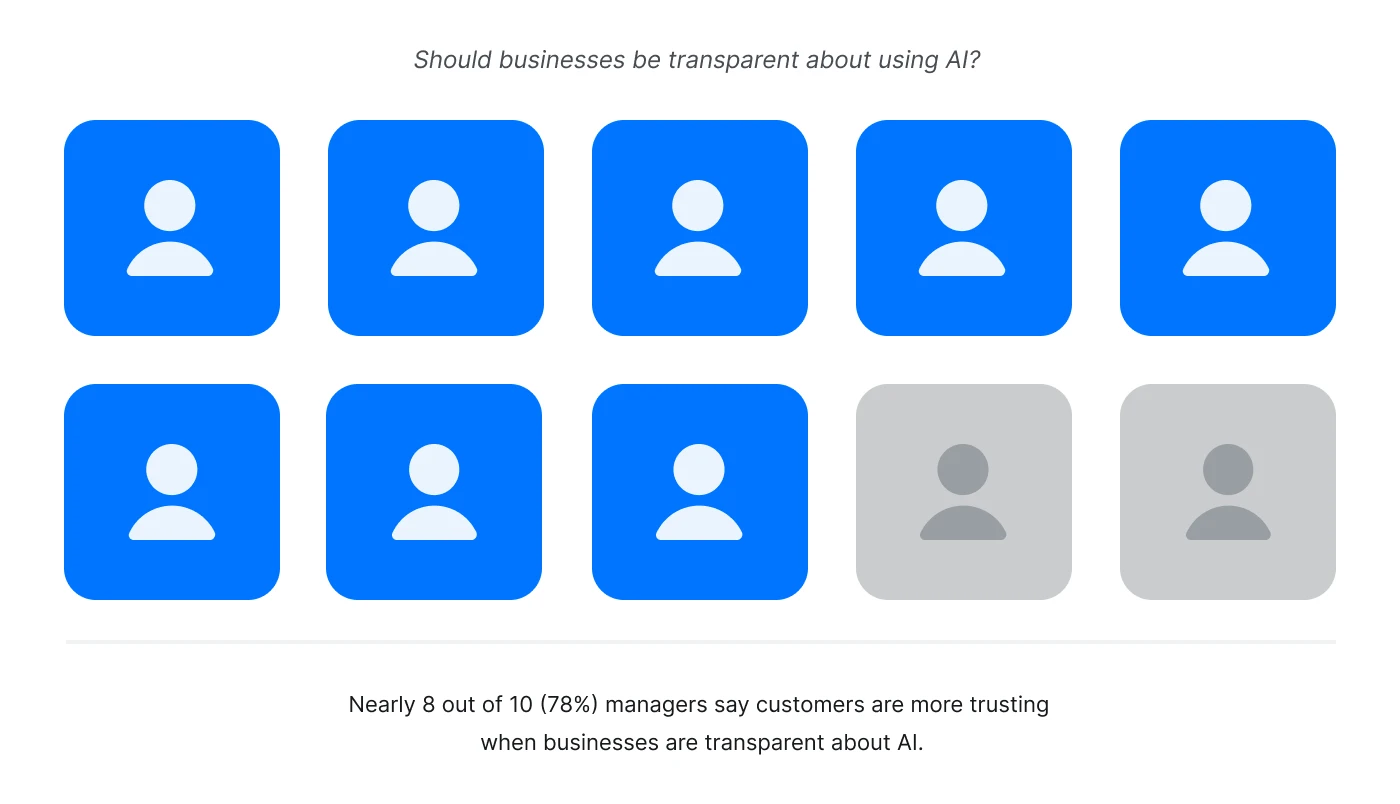 Nearly eight in ten managers (76%) said customers are more likely to trust a company that is transparent about using AI in customer interactions. This indicates customers don’t mind AI involvement, but they want to know when they’re engaging with it.
