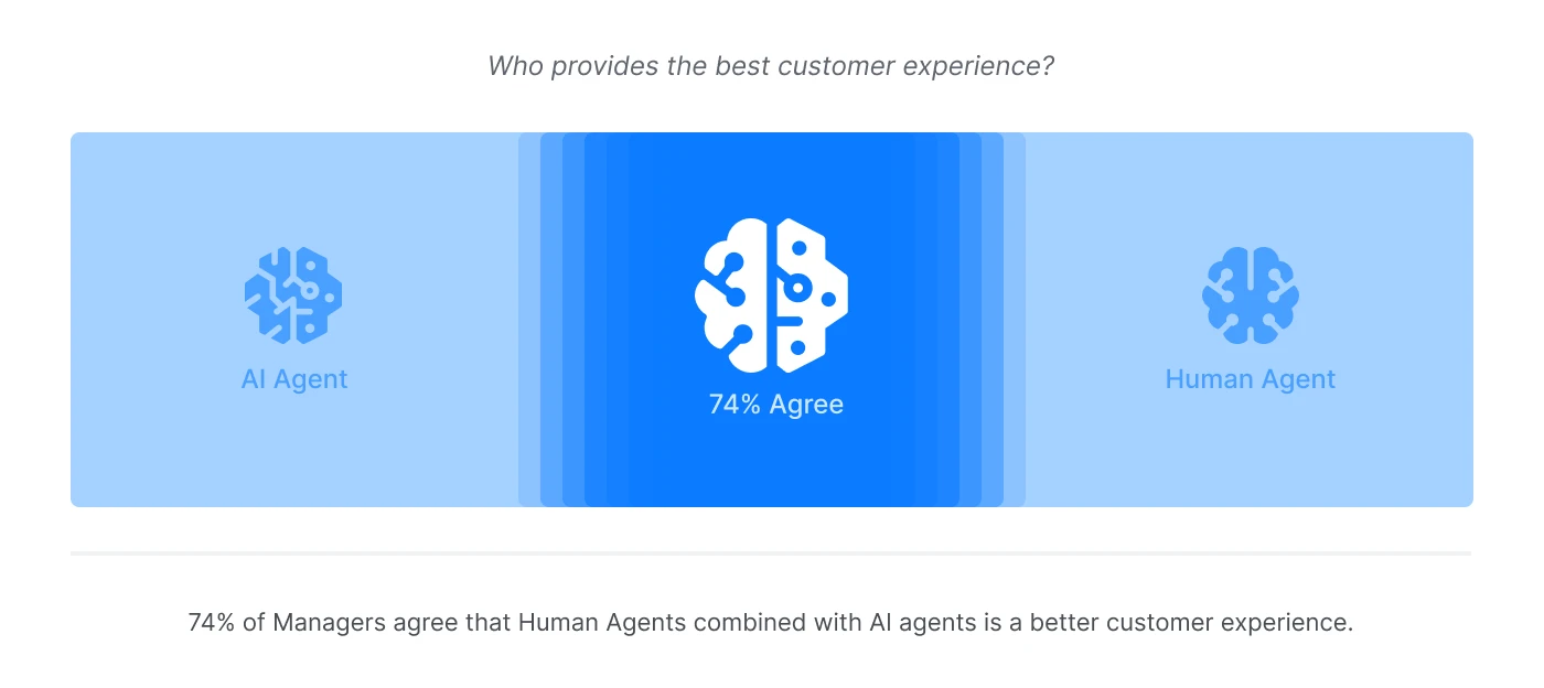 Rather than viewing AI as a replacement for people, most managers see it as a partner. A resounding 74% agreed that the best customer experiences will come from a partnership between human agents and AI agents working together, with only 9% disagreeing.